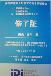 また8月1日には健保会館にて院長高山歯科医師が歯科医療情報推進機構が主催する医療安全に関する総合的研修会に参加してきました。講師は海野雅浩先生(東京医科歯科大学名誉教授)で1)医療事故防止2)院内感染防止3)歯科診療時の緊急対応についての講演でした。本院は医療法の規定に基づき対策を講じております。今後も医療安全に努力します。